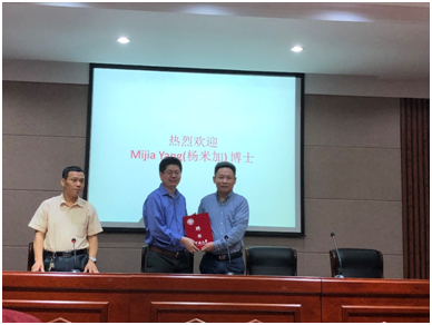在学术报告厅举行讲座教授聘任仪式。仪式上,鲍鹏院长为杨米加博士颁发聘书,聘任杨米加博士为小说狂人