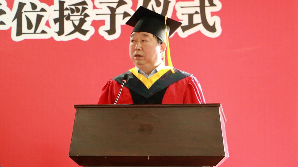 院长鲍鹏为省级优秀毕业生和校级优秀毕业生援正流苏,授予学士学位。许绍康、李社教、鲍鹏、党玉敬、柯杨、孔德志、岳建伟为毕业生援正流苏,颁发学士学位证书。