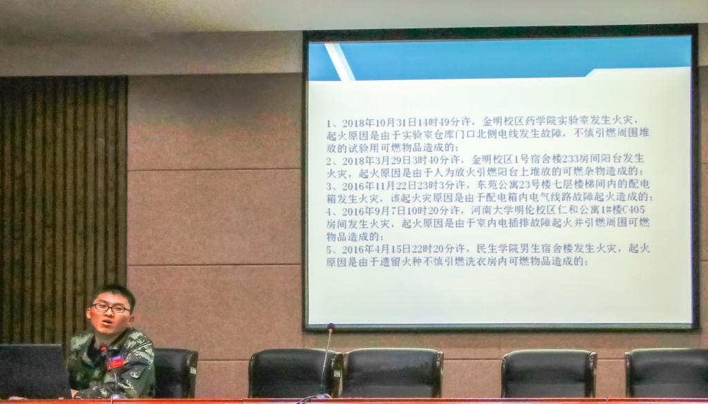 张科长从学校火灾的特点,为什么要开展消防安全预防和怎样进行消防安全预防三方面进行了讲解。他首先根据学校自2013年以来的火灾案例进行举例说明,从可能会引起火灾的方面讲到火灾隐患的类型以及火灾造成的损失;提出应从完善制度预案,保障消防资金投入,保障疏散通道出口畅通,消防器材完整好用和加强消防队伍建设等几个方面开展消防安全预防。讲座期间放映的一系列火灾现场的录像视频,让大家更清晰、更直观的认识到了火灾无情,加强对消防安全的重要性。