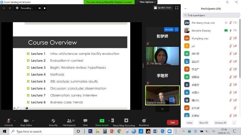 第一讲由美国康奈尔大学Mardelle McCuskey Shepley教授于5月2日开讲,通过Zoom线上进行,省特聘教授王哲主持,设计学专业全体硕士研究生参加了聆听和交流。该课程有助于有意识地将研究纳入设计过程:对建成环境的评估。除了描述和评价先例外,它还讲述了开展这些研究的过程。设计团队必须对环境对使用者负责。规范良好的评估是客观地验证我们是否实现了预期的目标的一种手段。
