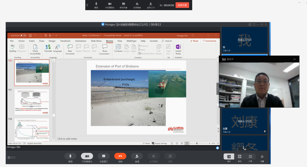 第二讲由澳大利亚格里菲斯大学Erwin Oh教授于5月5日开讲,通过钉钉线上直播进行,张建伟副院长主持,秦红玉博士和王浩博士在线全程参与讨论。本课程主要应用土力学原理解决实际工程中的基础工程问题,特别是基础工程设计过程中的分析和计算方法。主要包括:现场调查和原位测试;浅基础的承载力和沉降分析;竖向荷载和水平荷载作用下桩基础的分析与设计等。