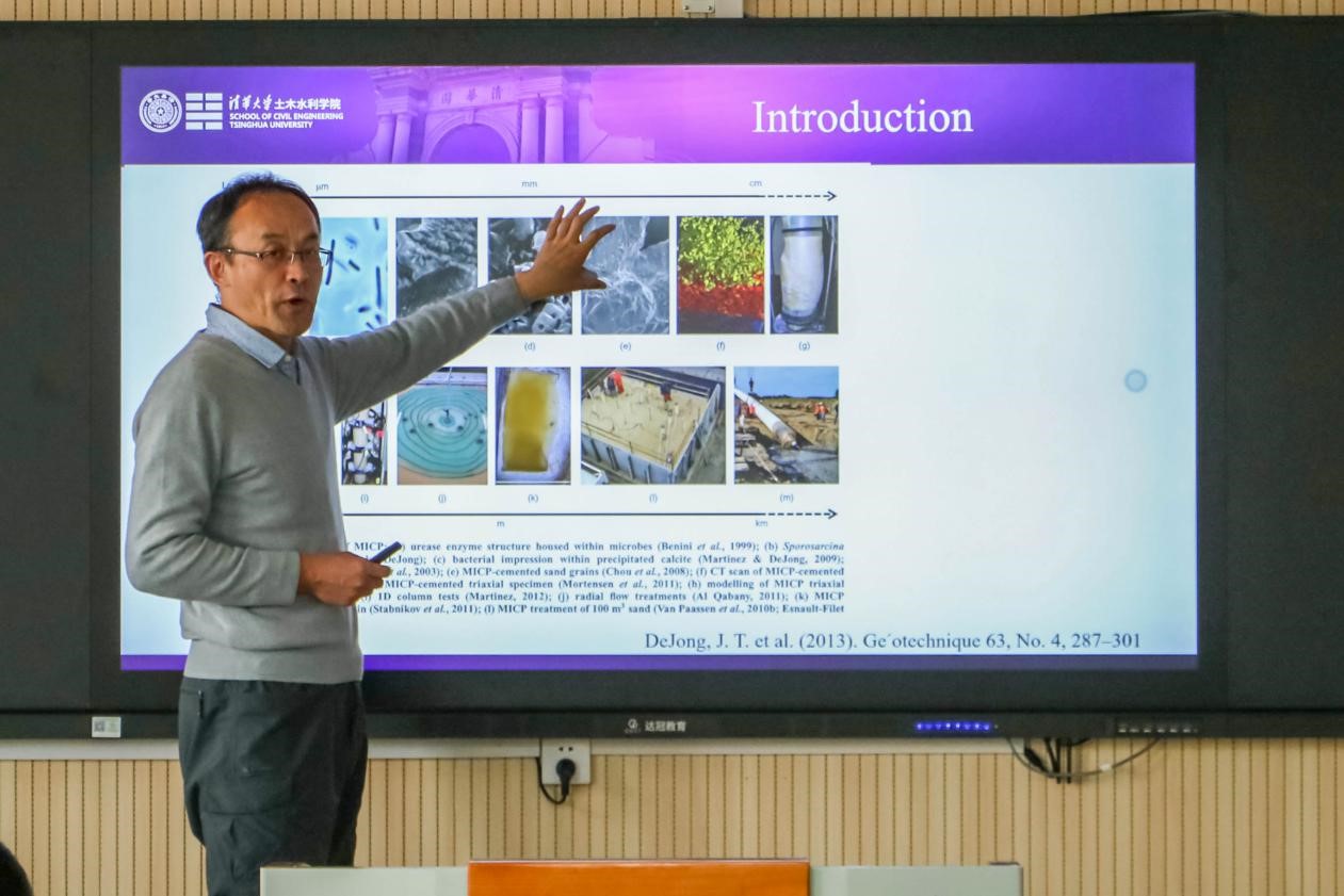 16B智慧教室606分别做了题为“A Feasibility Study of High Strength MICP Based Soil Improvement”、“大型土工离心机专项测试技术与实验”的学术报告。学术报告会由院长岳建伟教授主持,土木工程专业部分师生参加了报告会。