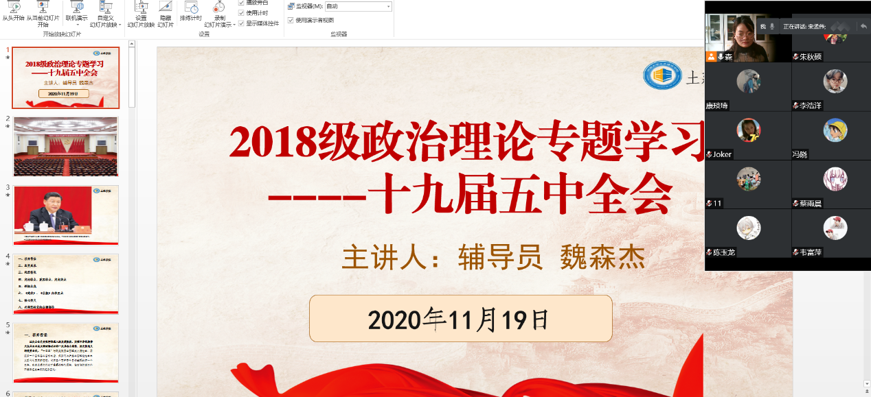 2018级举行政治理论学习会议,集中学习党的十九届五中全会精神。会议采取网络视频形式举行,全体252名学生参加了会议。