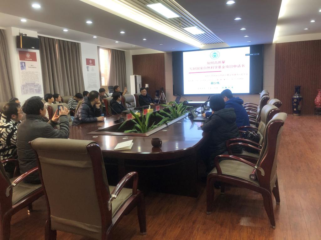 16B204室对国家自然科学基金申请书的撰写进行指导。全院拟申报国家基金的教师近20人参加了会议,会议由副院长张建伟教授主持。