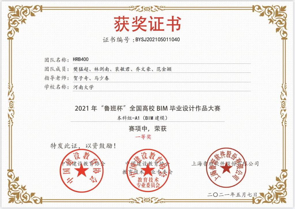 HRB400队的BIM作品为安徽省古生物化石博物馆,总建筑面积26495平方米,地上四层,地下一层,设有地下停车场。场馆分为南北两座建筑,分别向两个不同方向倾斜,中间采用玻璃幕墙系统采光,并用长廊连接。场馆内楼梯、走廊、楼板等部位为特色设计。在BIM设计过程中,范金颍负责场布模型、电气模型建模、安装模型碰撞检测优化、Naviousworks动画制作、汇报PPT、视频制作;林剑南负责土建模型建、REVIT高级应用点制作、施工段划分、施工进度计划制作;乔文豪负责给排水、消防模型建模、安装模型碰撞检测优化、鲁班造价应用点制作;樊猛超负责钢筋模型建模、钢筋模型应用点制作;裴敏君负责暖通模型建模、安装模型碰撞检测优化和Lumion后期制作。