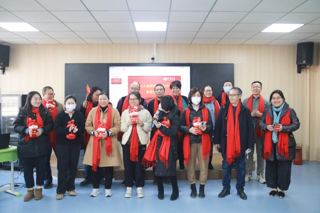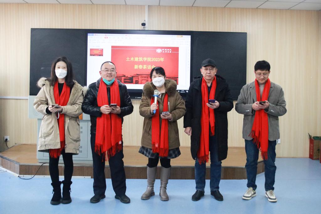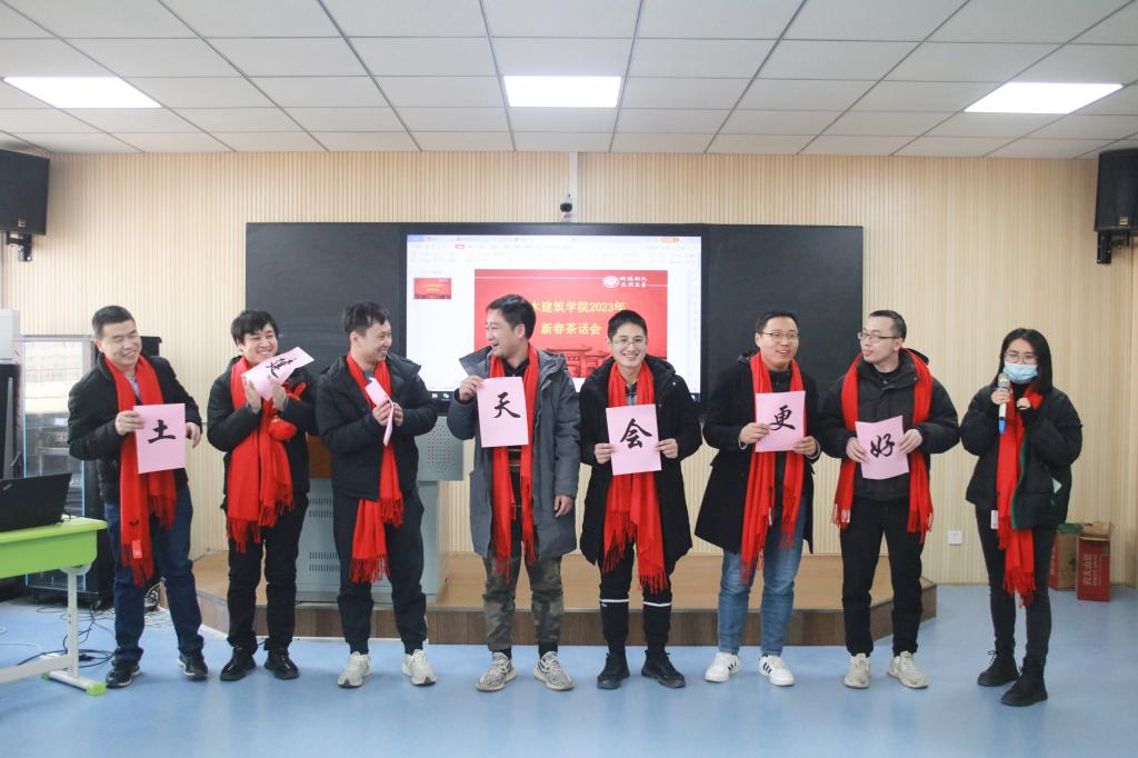 接下来,建筑工程系、路桥工程系、地下空间工程系、建筑系和城乡规划系等系的专业教师,在5位系主任的带领下以系为单位向大家拜年。随后,学院副院长党玉敬和行政人员,副院长张大伟和实验室负责人,副院长张建伟和科研机构(平台)负责人,全体辅导员,分别以不同的形式向大家拜年。现场开展的定点投掷羽毛球趣味活动,将气氛推向高潮,茶话会在老师们的欢声笑语中结束。