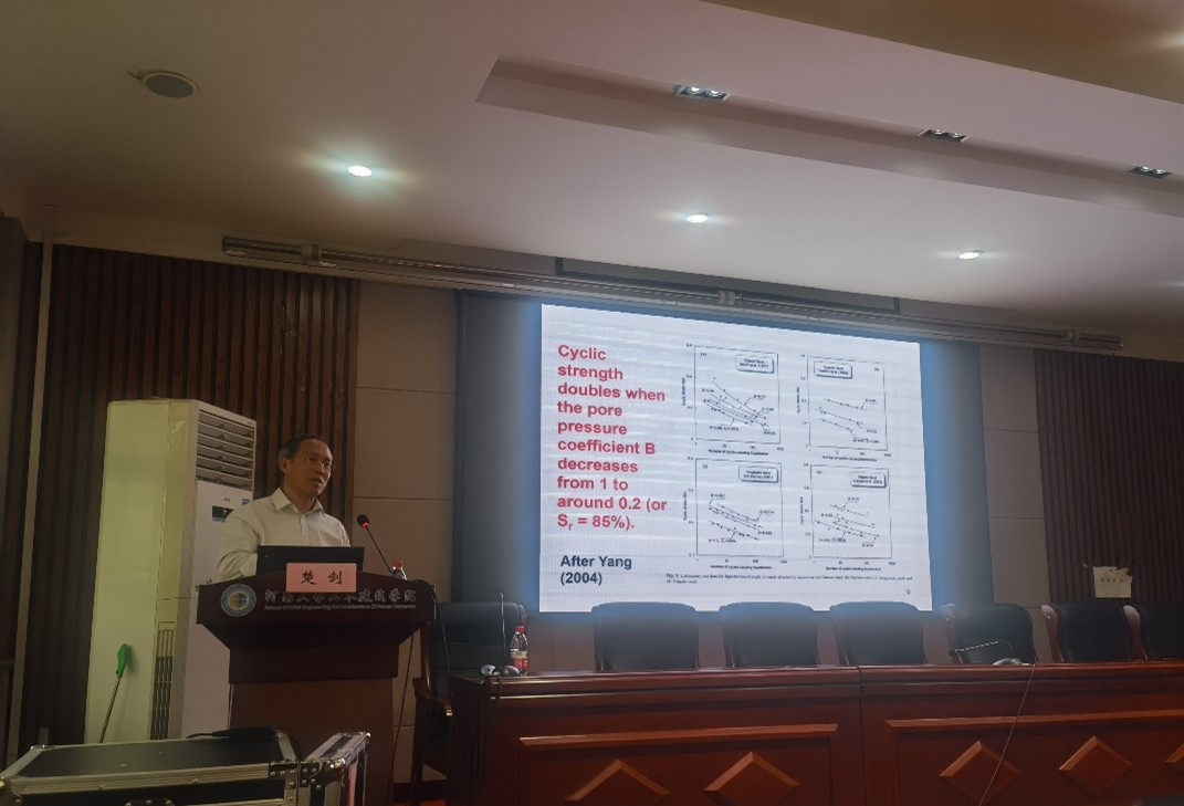 楚剑教授报告的题目为《Use of Biogas Desaturation and Biogel for Soil Improvement》(《生物制气法和生物凝胶法在地基处理中的应用》)。报告主要介绍微生物岩土技术的最新发展动态,包括生物胶结、生物封堵、沼气/生物凝胶和生物包裹;重点介绍了生物胶结和沼气脱饱和在提高砂土抗液化能力方面的应用;最后介绍了由其团队自主研发的生物凝胶法在缓解液化和岩土体降渗方面的最新进展。报告结束后,楚剑教授与小说狂人