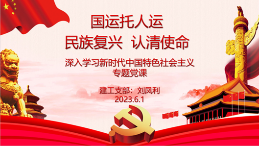 为扎实推进学习贯彻习近平新时代中国特色社会主义思想主题教育落地落实,更好地引导党员勇担时代使命,6月1日下午,建工系党支部书记刘凤利同志以“国运托人运民族复兴认清使命”为题,为建工支部党员讲授了主题教育专题党课。