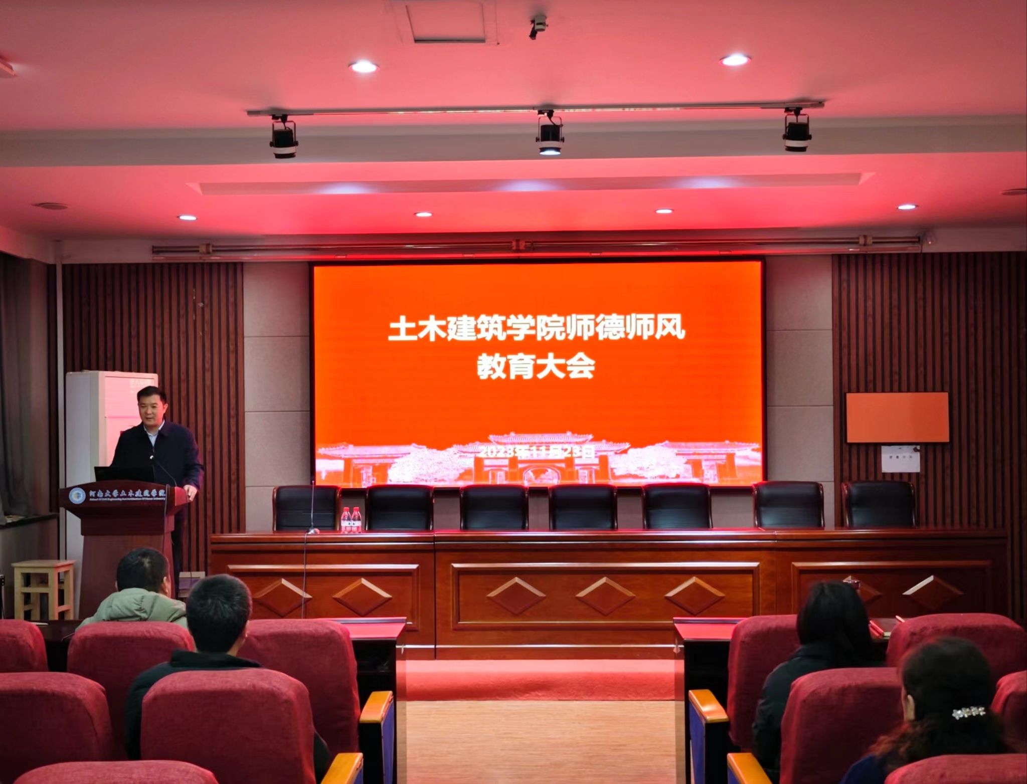在结构实验室学术报告厅召开师德师风学习教育大会,校党委教师工作部副部长赵炎作师德师风专题报告。学院全体教师参加,会议由学院党委书记南晗主持。