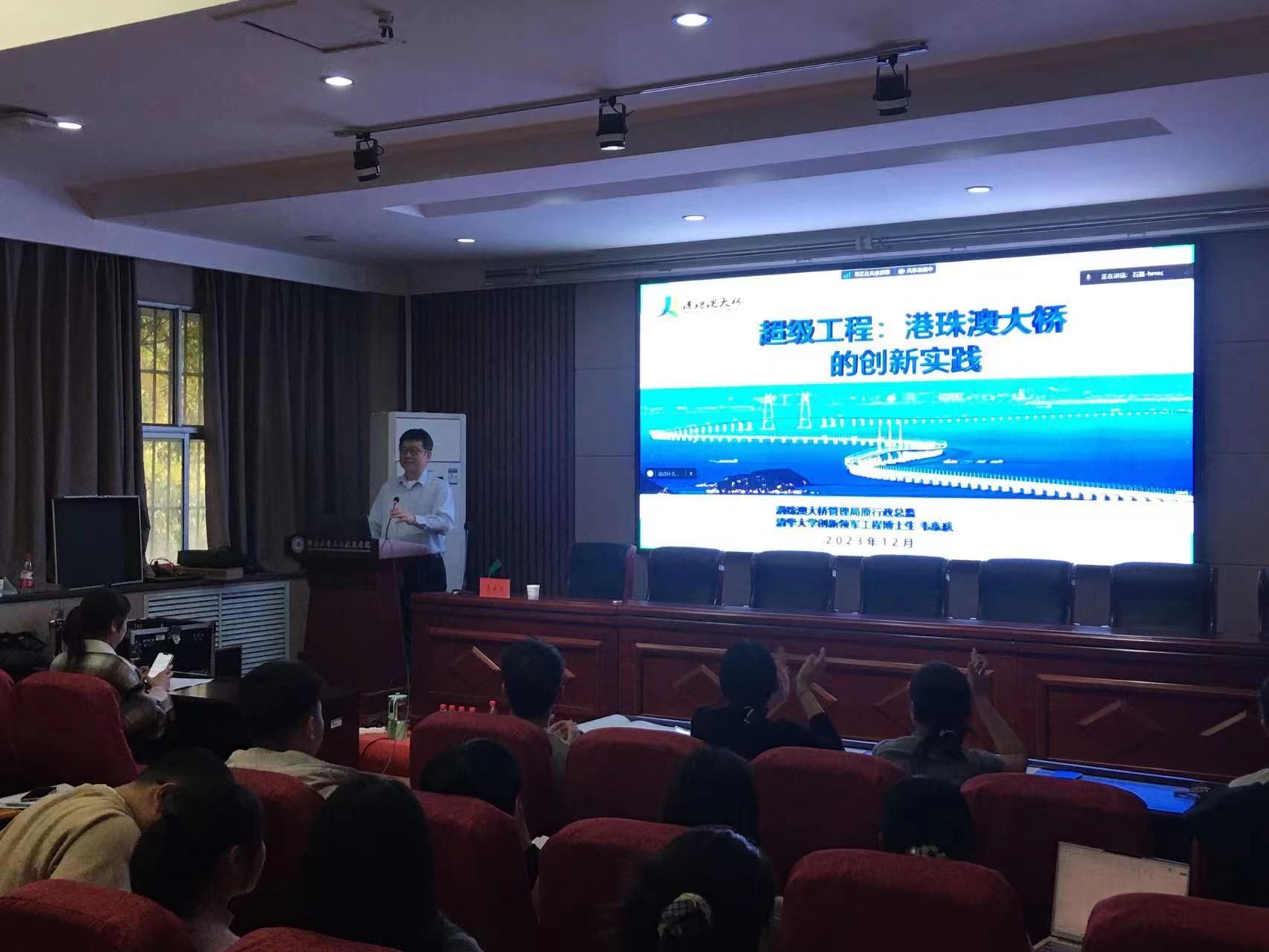 12月8日,港珠澳大桥行政总监韦东庆应邀,在学院结构实验室二楼报告厅做题为“超级工程:港珠澳大桥的创新实践”的学术报告。学院土木工程专业高年级本科生、研究生及部分教师到现场参加了报告会,报告同时以线上方式向工程管理专业研究生直播,报告会由副院长原华主持。