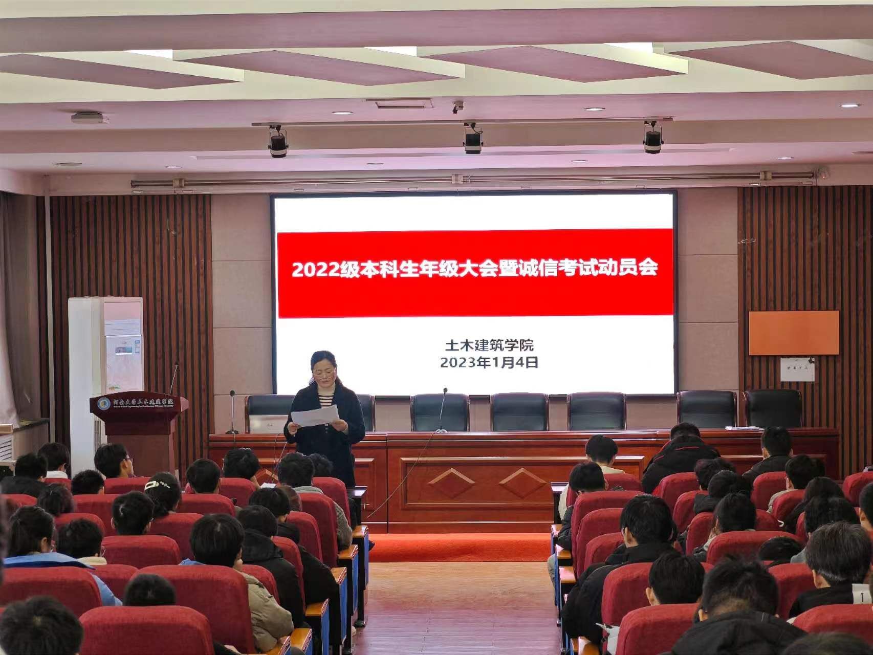 2022级本科生在结构实验室二楼学术报告厅召开了年级大会暨诚信考试动员会。大会主要包括学期总结、学籍管理规定文件学习、诚信考试教育、诚信与资助知识竞赛、安全教育等内容。