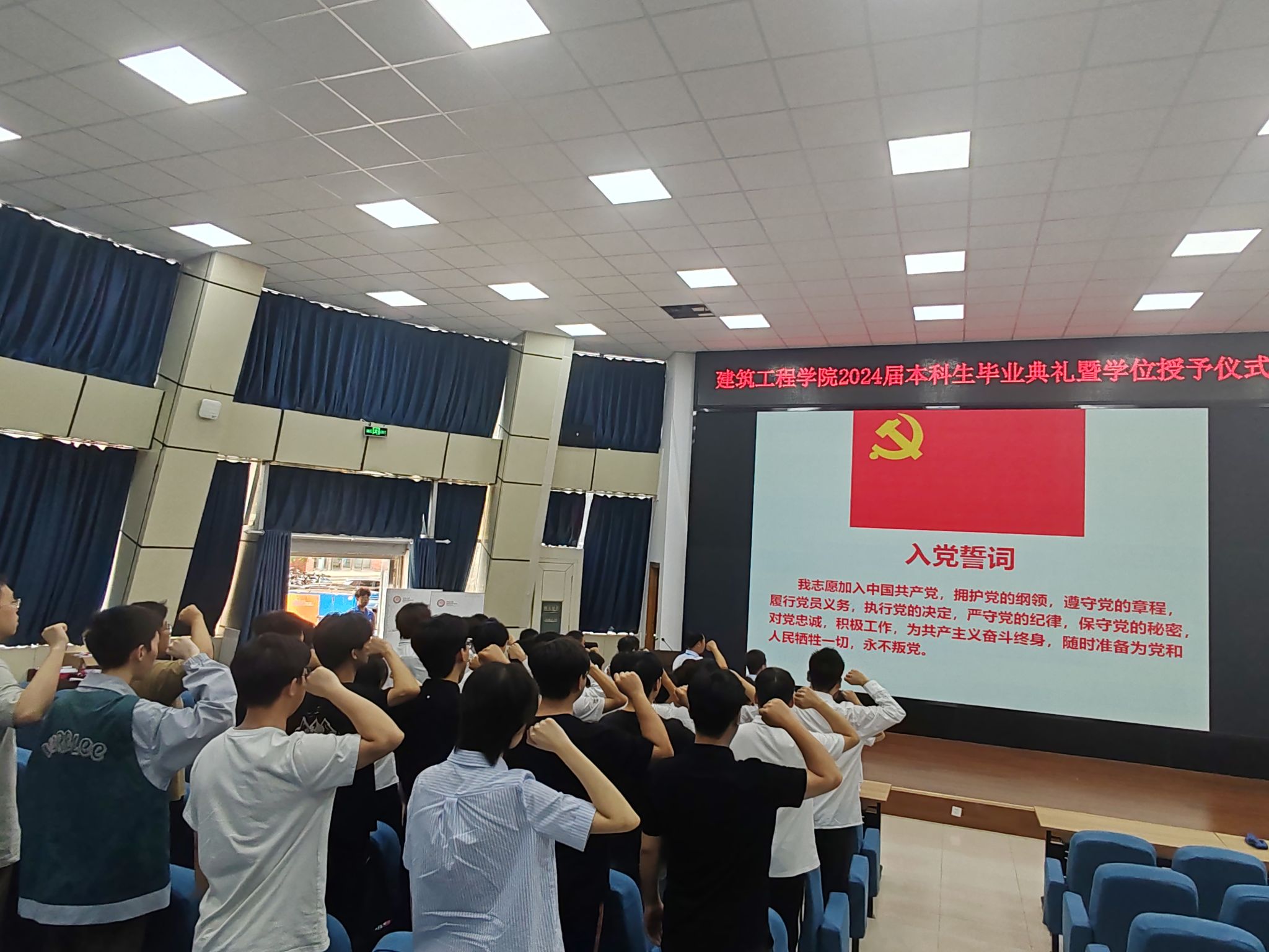 毕业典礼后,学院党委书记南晗带领学院全体班子成员和毕业生党员面向党旗庄严宣誓,重温入党誓词。党员同志们将初心牢记心中,将使命担在肩上,心怀坚定的理想信念,开启新的征程。
