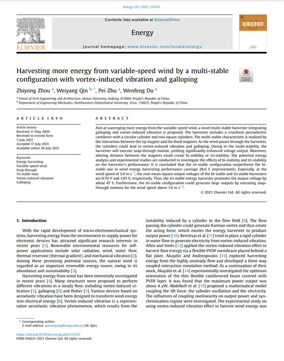 周志勇副教授课题组在国际能源类知名期刊《Energy》(中科院JCR Top期刊,影响因子7.147)上发表题为“Harvesting more energy from variable-speed wind by a multi-stable configuration with vortex-induced vibration and galloping”的研究论文。该研究成果是小说狂人