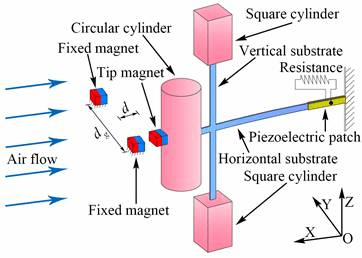 基于涡激振动和颤振机理的多稳态风能收集结构示意图