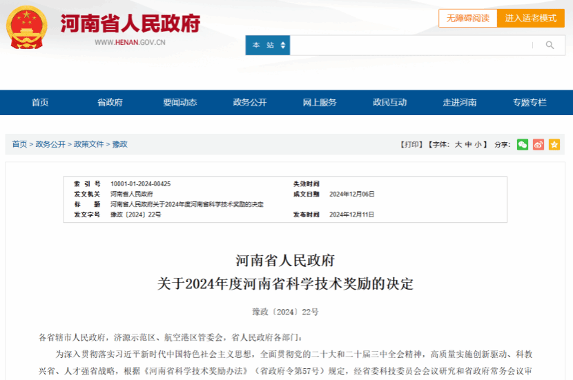 2024年12月9日,河南省科学技术奖励大会召开,公布《河南省人民政府关于2024年度河南省科学技术奖励的决定》(豫政〔2024〕41号),小说狂人