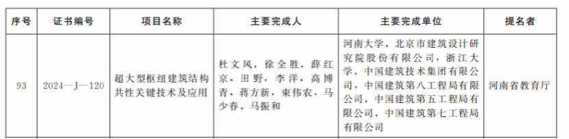 杜文风教授主持的科研成果“超大型枢纽建筑结构共性关键技术及应用”获得河南省科学技术进步奖二等奖。