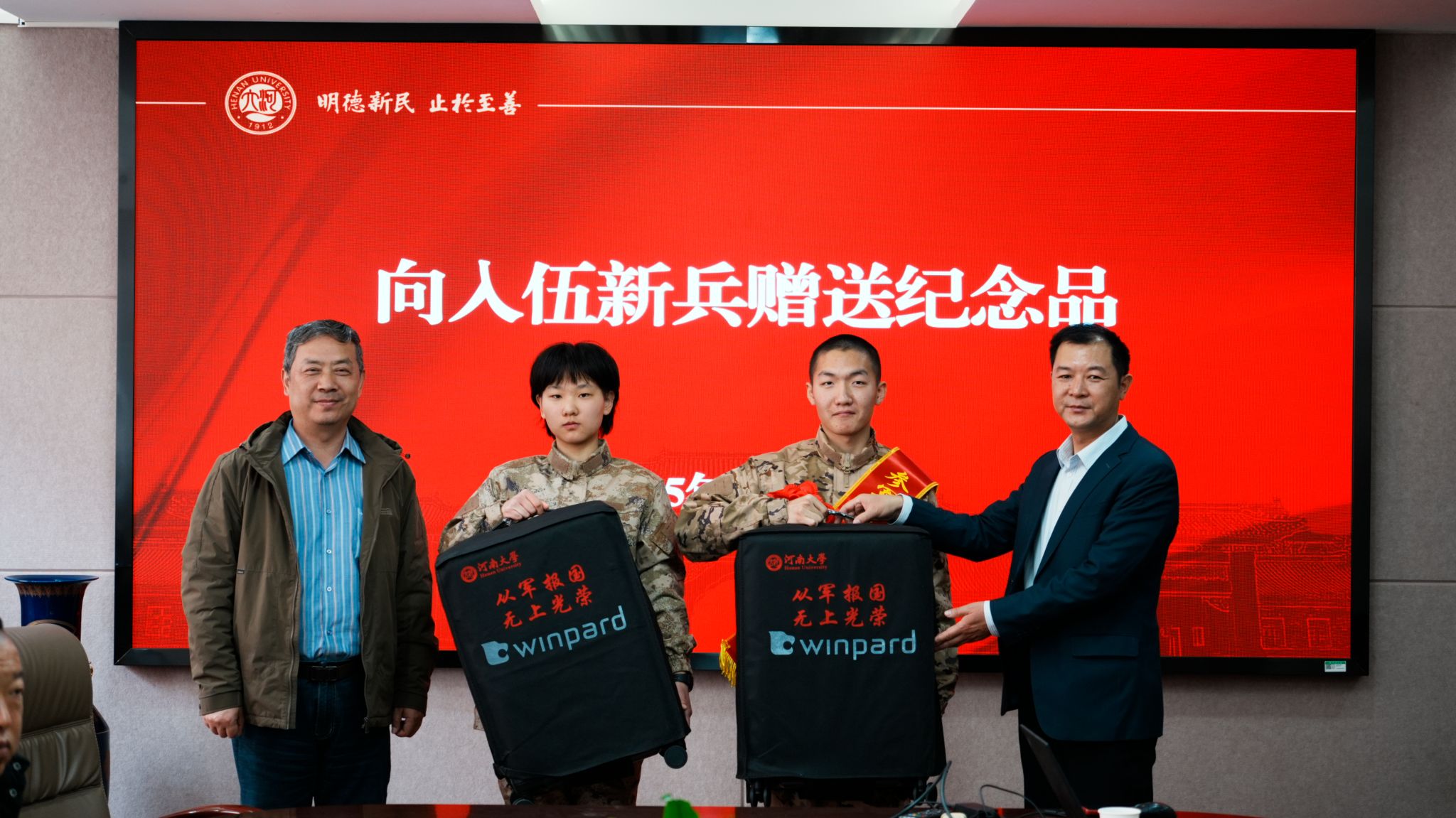 随后,张霖、南晗向入伍新兵赠送纪念品。