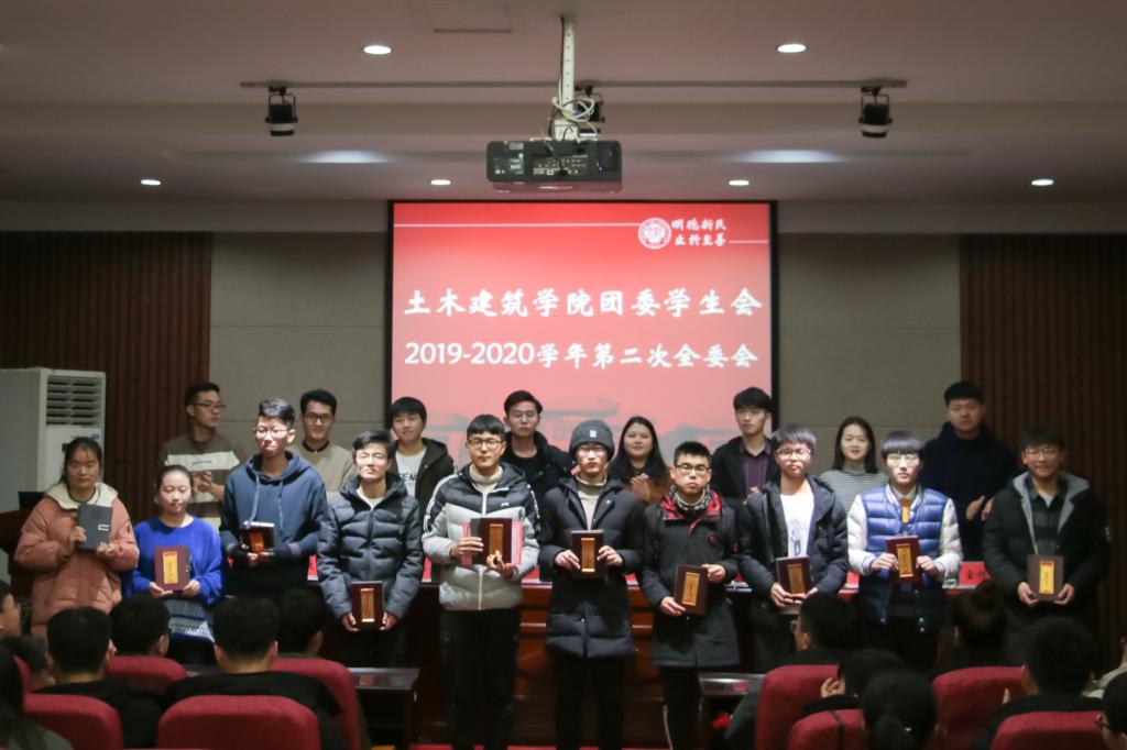 Zhou Shenglang, deputy student Secretary of the Youth League Committee, read out the commendation decision of student leaders of the student union of the Youth League Committee of the Institute of civil engineering and architecture and the science and innovation center of university students in the first semester of the 2019-2020 academic year. Mr. Xu Guixiang and members of the presidium presented honorary certificates and prizes to the award-winning cadres and took a group photo as a memento.