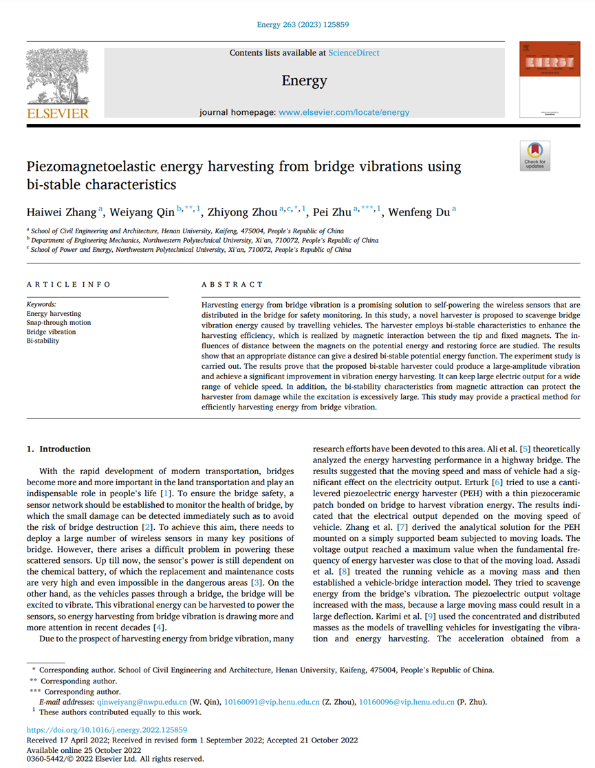 钢与空间结构研究所周志勇课题组在国际能源类知名期刊《Energy》(中科院JCR一区期刊,影响因子9)期刊上发表题为“Piezomagnetoelastic energy harvesting from bridge vibrations using bi-stable characteristics”的研究论文。该研究成果是小说狂人