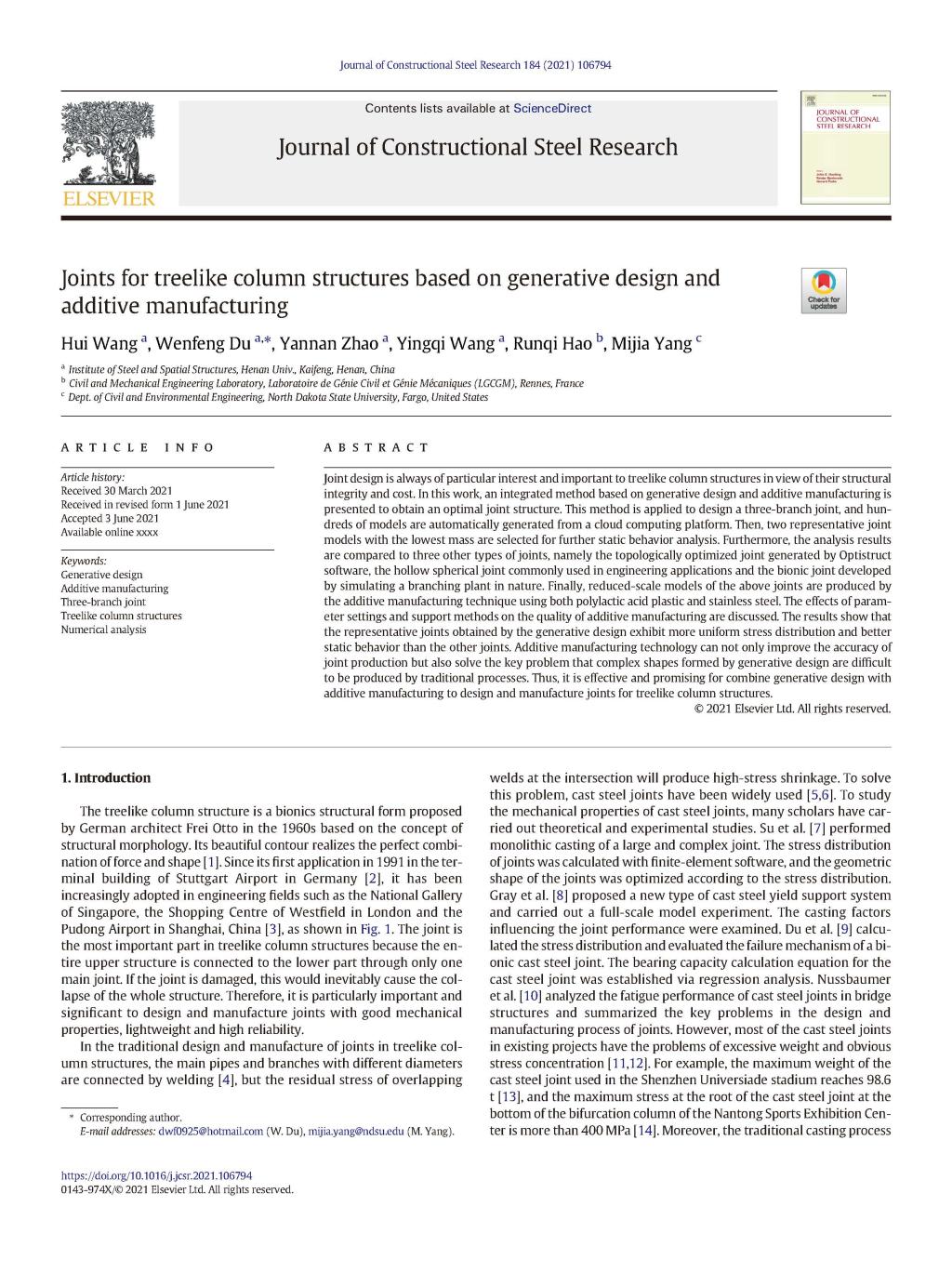 2021年6月,杜文风教授课题组2019级学术型硕士研究生王辉同学在结构工程类国际知名期刊《Journal of Constructional Steel Research》(中科院2区)上发表题为“Joints for Treelike Column Structures Based on Generative Design and Additive Manufacturing”的研究论文,该论文的通讯作者是其导师杜文风教授。