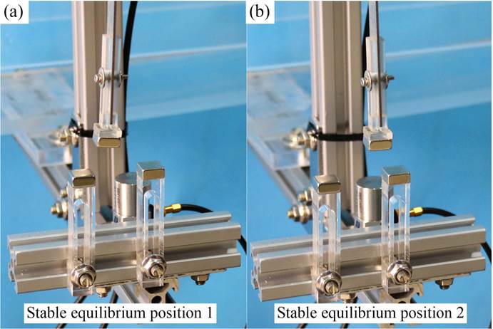 双稳态桥梁俘能结构的两个稳定平衡状态(a)稳定平衡点1,(b)稳定平衡点2