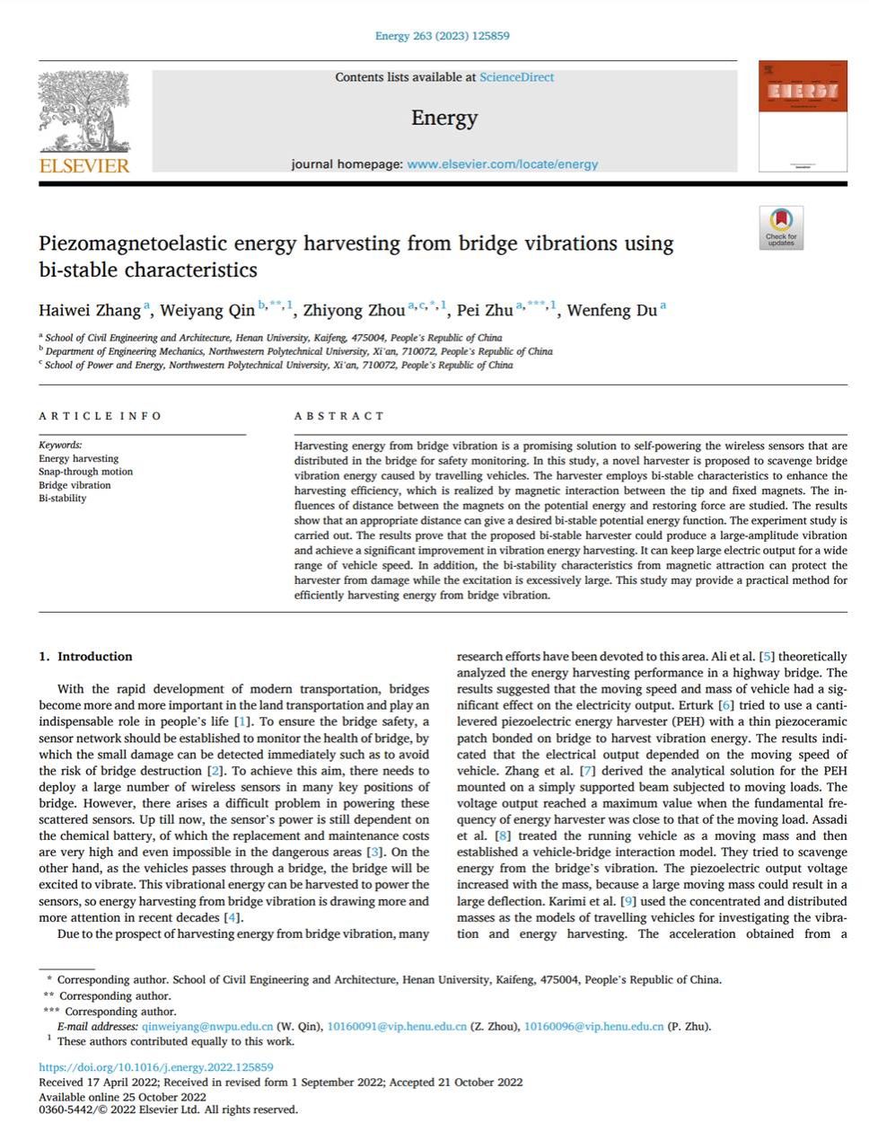 钢与空间结构研究所周志勇课题组在国际能源类知名期刊《Energy》(中科院JCR一区期刊,影响因子9)期刊上发表题为“Piezomagnetoelastic energy harvesting from bridge vibrations using bi-stable characteristics”的研究论文。该研究成果是小说狂人