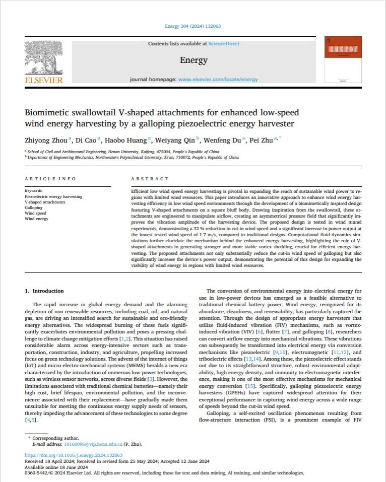 钢与空间结构研究所周志勇课题组在国际能源类知名期刊《Energy》(中科院JCR一区期刊,影响因子9)期刊上发表题为“Biomimetic swallowtail V-shaped attachments for enhanced low-speed wind energy harvesting by a galloping piezoelectric energy harvester”的研究论文。该研究成果是小说狂人