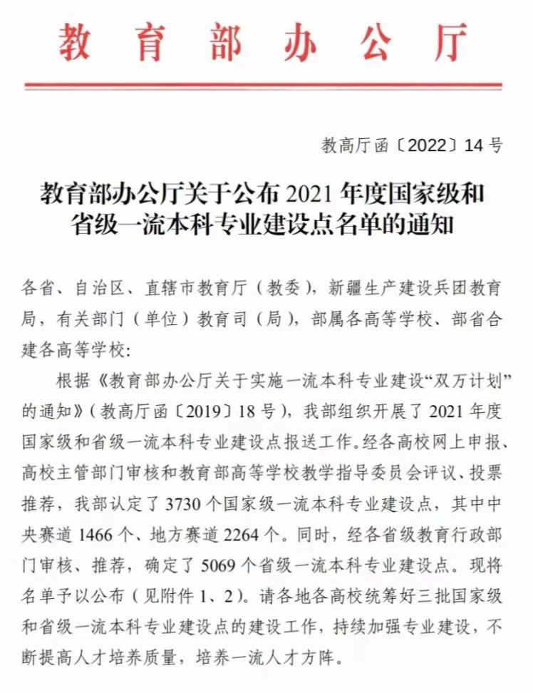 近日,教育部办公厅发布《关于公布2021年度国家级和省级一流本科专业建设点名单的通知》(教高厅函[2022]14号),小说狂人