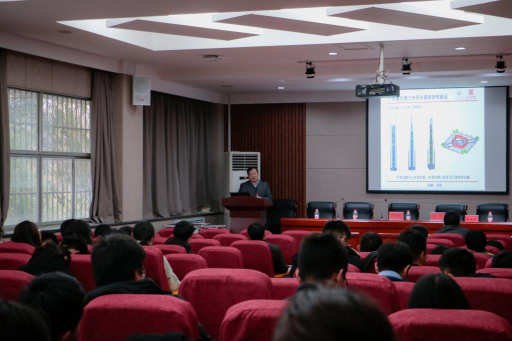 结构实验室报告厅做关于超高层建筑结构抗震性能研究及工程实例学术讲座,本次讲座由学院副院长张建伟教授主持。