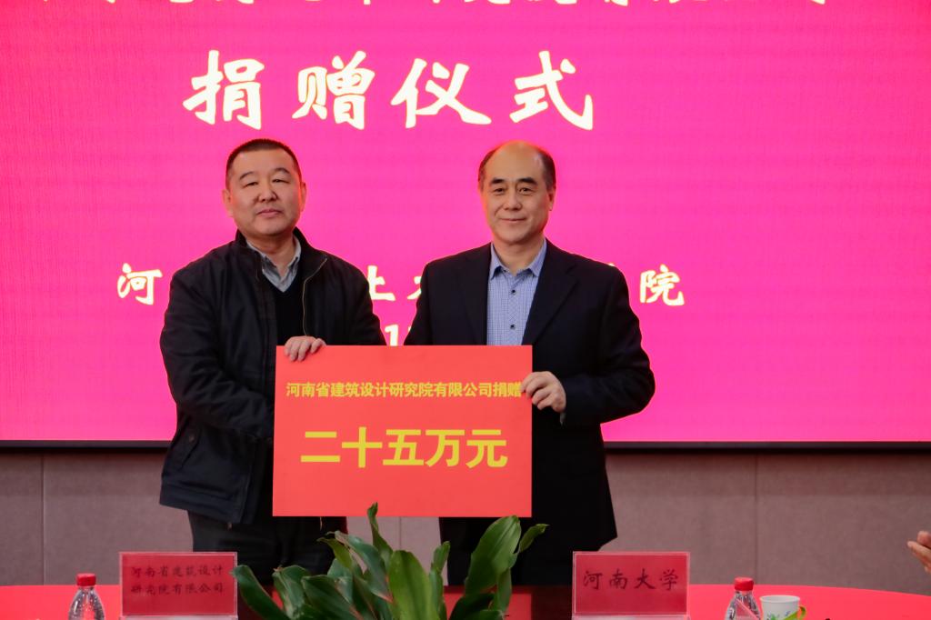 自建校以来,一直严守明德新民、止于至善的校训与团结、勤奋、严谨、朴实的优良校风,在不同的历史时期,为民族复兴和国家建设做出了杰出的贡献,赢得了社会的认可和尊重。2017年学校进入国家一流学科建设高校行列,创建一流大学,离不开社会各界的大力支持与帮助。河南省建筑设计研究院有限公司重视建筑创作,推进技术进步,讲求社会信誉,积极承担社会责任,投身社会公益事业,为中原崛起、河南振兴做出了重要贡献。此次捐赠将进一步助推土建院科研事业的发展,也充分展示河南省建筑设计研究院有限公司的大爱。并希望双方以后加强合作,促进校企合作实现共赢。