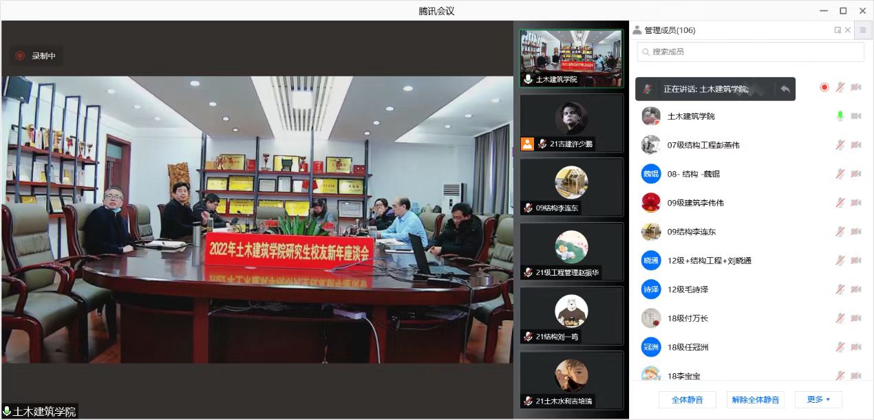 党委书记李社教、院长岳建伟、副院长党玉敬、张大伟、张建伟、原华等全体领导及校友办主任杨卫红在土建院校史馆线下参会,各届研究生校友共计110余人在全省各地线上参会。