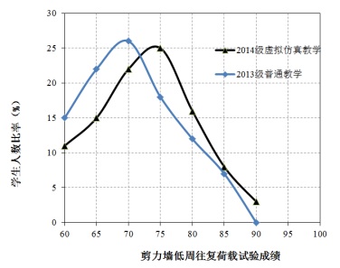 我们统计分析了采用虚拟仿真教学的2014级与采用手段前的2013级学生在剪力墙实验中成绩情况,如图5所示,教学效果明显提升。