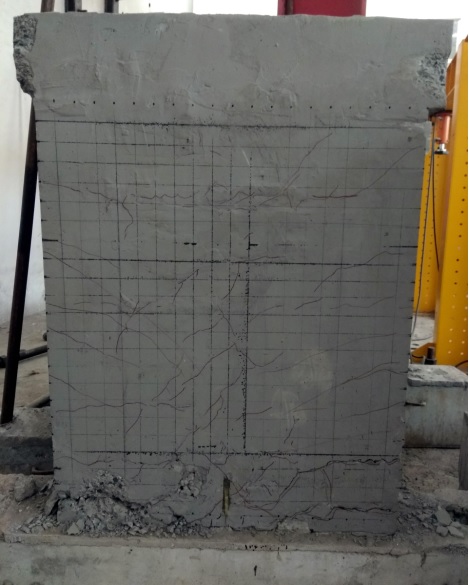 实验中学生可以对剪力墙施加虚拟破坏荷载(图7),观察实验过程中剪力墙的变形破坏情况(图8),图8中第一批裂缝产生自剪力墙根部的水平裂缝,随着荷载的增大,产生剪切斜裂缝,由于荷载往复,根部裂缝基本呈“X”型剪切裂缝。同时根据虚拟传感器记录的数据,绘制成应力位移滞回曲线(图9),滞回曲线开始呈梭形,随着荷载增大,钢筋滑移,滞回曲线呈反“S”型,在轴压比不大的情况下,滞回曲线饱满,轴压比越大,滞回曲线越不饱满,捏缩越严重;